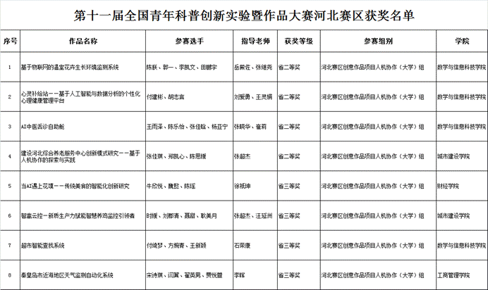 第十一届全国青年科普创新实验暨作品大赛河北赛区比赛由省科协、省教育厅与共青团河北省委联合主办,省科技馆、保定市科协与河北大学联合承办,近日圆满落幕。我校共有8个项目获奖,其中二等奖4项,三等奖4项。