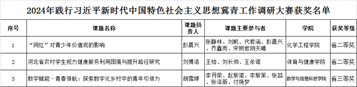 2024年践行习近平新时代中国特色社会主义思想冀青工作调研大赛由共青团河北省委、河北省社会科学院联合举办,近日公布获奖名单,我校共有3个项目获奖,其中二等奖2项,三等奖1项。