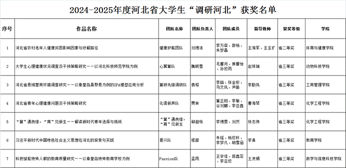 2024-2025年度河北省大学生“调研河北”社会调查活动由共青团河北省委、河北省社会科学院、河北省学生联合会联合主办,近日揭晓了评选结果,我校在本次活动中获奖7项,其中二等奖1项、三等奖6项。