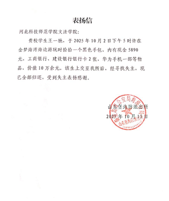 2025年10月15日下午,山东堡海防派出所民警专程来到我校,送来一封表扬信,对22级法学专业学生王一驰拾金不昧的行为予以表彰。此前,他在金梦海湾沙滩拾获并归还总价值超过10万元的财物,以朴实善举展现出新时代青年的责任与担当。
