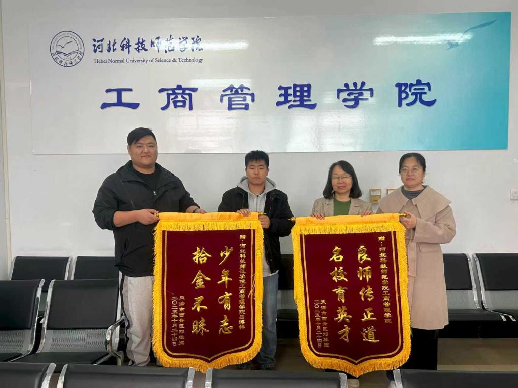 失主是从天津来秦皇岛办事的邓先生,当他发现物品遗失后急出了一身冷汗,抱着试试的心态向白塔岭派出所报警求助。没想到报警不一会儿,派出所民警就通知他来认领。邓先生激动不已,对吕博祥的善举和民警的高效服务表示万分感谢,并请派出所工作人员帮忙与吕博祥同学取得联系。24日,邓先生专门制作了两面锦旗,专程来到我校工商管理学院,对拾金不昧的吕博祥当面致谢。