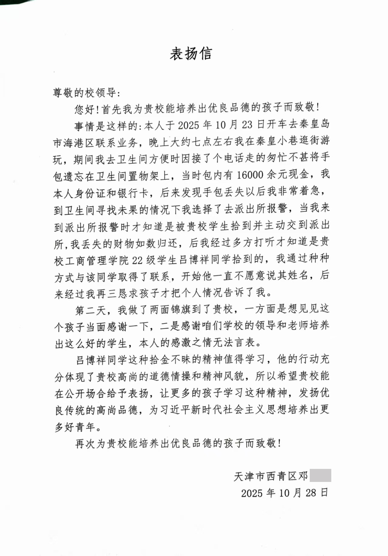 事情的经过是这样的,2025年10月23日晚上7时许,我校工商管理学院2022级旅游管理专业学生吕博祥与3名室友前往秦皇岛海港区秦皇小巷购买食品。其间,吕博祥去卫生间时,发现置物架上有一个遗失的手包。他赶紧打开查看,包里有一万多元现金和多张银行卡及身份证等物品,心想,失主丢失手包一定心急如焚。当即在卫生间旁边等候并急切寻找失主。寻找未果后,便带第一时间前往白塔岭派出所,将手包及包内1.6万余元现金和所有银行卡及证件完整地交给值班民警,并详述了捡包过程。随后放心地返回学校。白塔岭派出所努力与失主邓先生取得了联系,将吕博祥同学捡到的手包及包内现金和物品完璧归赵。