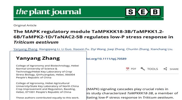 近日,我校农学与生物科技学院张艳阳在“The Plant Journal”(中科院一区TOP,IF=5.7)发表了题为“The MAPK regulatory module TaMPKKK18-3B/TaMPKK1.2-6B/TaMPK2-1D/TaNAC2-5B regulates low-P stress response in T. aestivum”研究论文。农学与生物科技学院为论文第一通讯单位,该成果得到了国家重点研发项目(2022YFD1200204)、华北作物改良与调控国家重点实验室(NCCIR2022ZZ-7)和36365线路检测中心博士启动基金项目(2025YB018)的共同资助。