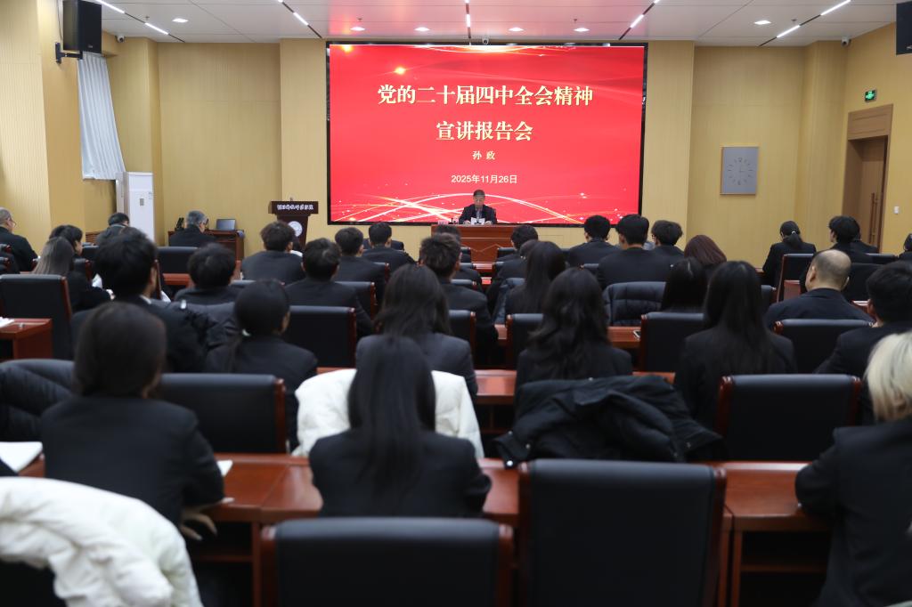 2025年11月26日,党委书记孙政宣讲党的二十届四中全会精神报告会在秦皇岛校区举行。党委副书记王松主持会议。