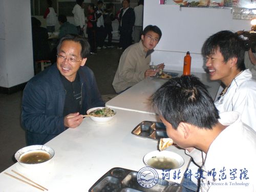 图为孟令臣副院长在检查过程中与大学生共进早餐