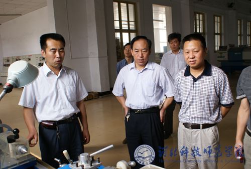 图为省教育厅专家组一行正在我校欧美学院工科实训基地考察
