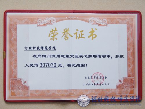 截止2008年5月16日上午9:00,我校为地震灾区捐款已达35.72764万元。河北电视台、秦皇岛电视台、秦皇岛晚报等多家媒体对我校为地震灾区捐款活动和对在校的震灾地区籍学生的慰问救助工作进行了专题报道。