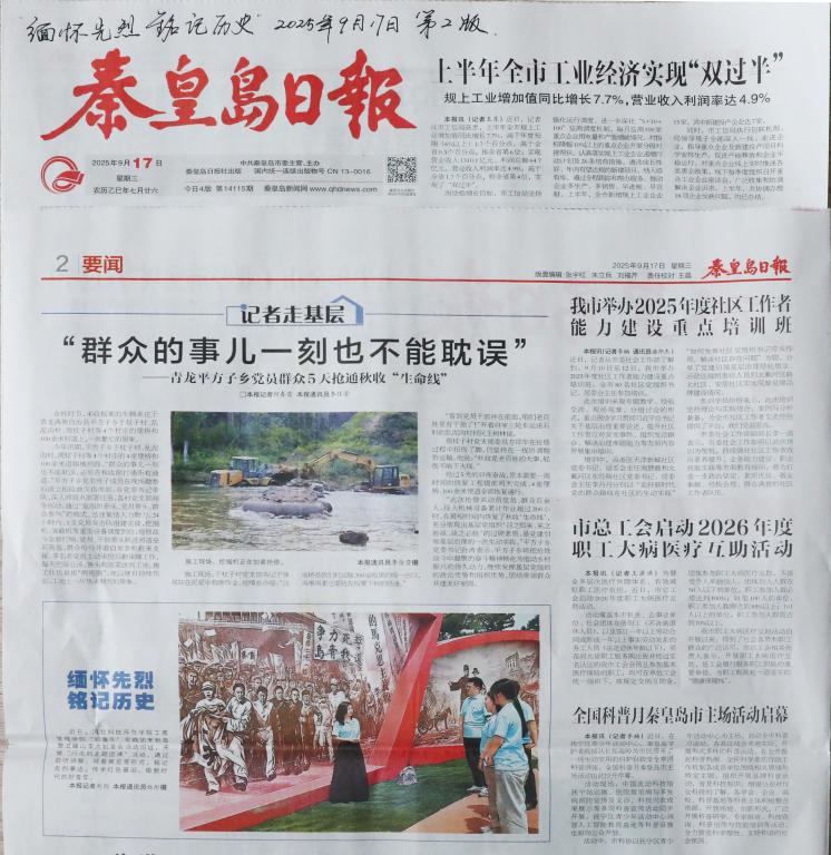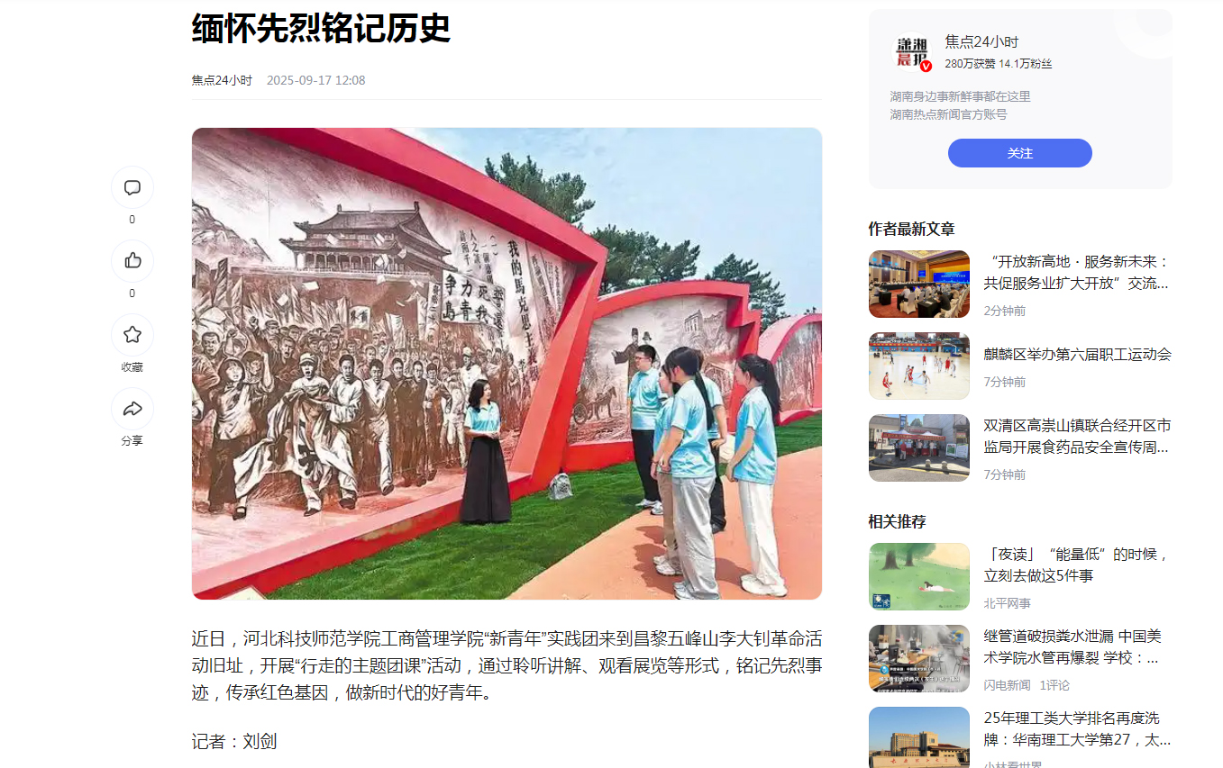 2025年9月17日,《秦皇岛日报》以“缅怀先烈 铭记历史”为题,对我校工商管理学院“新青年”实践团到昌黎五峰山李大钊革命活动旧址,开展“行走的主题团课”活动进行了宣传报道。同时,焦点24小时网、秦皇岛新闻等主要媒体均对活动进行了宣传报道。
