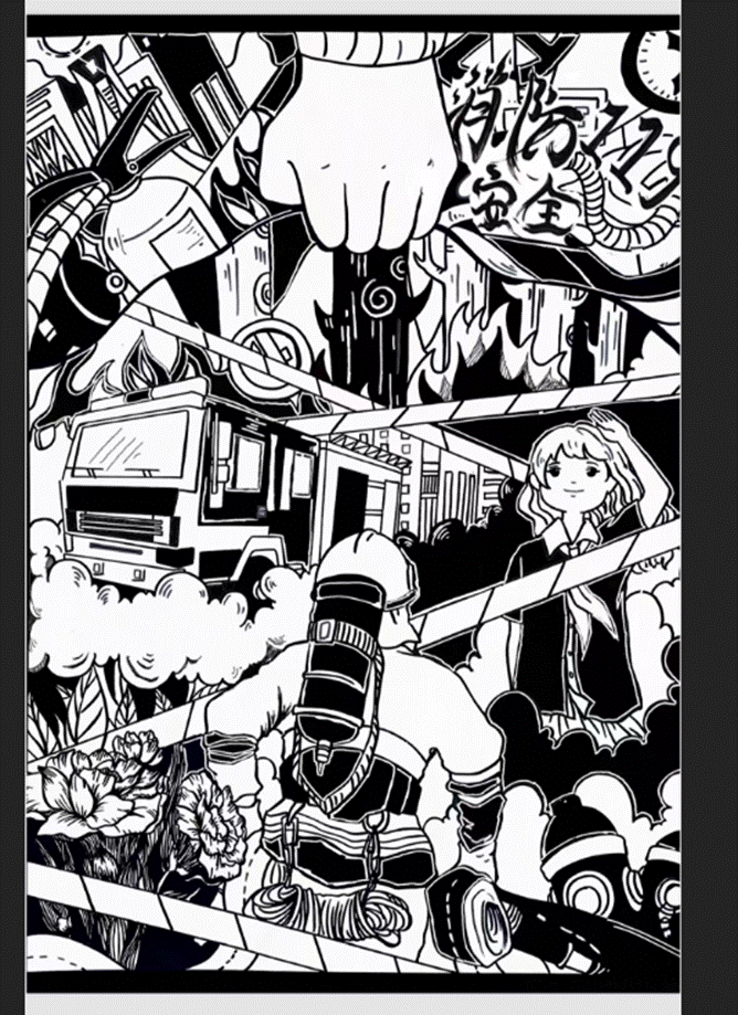 活动共收到参赛作品40余件,同学们围绕“消防英雄事迹”“消防安全知识”“应急避险技能”“火灾隐患警示”等核心方向,结合绘画、设计等专业特长,将抽象的消防精神转化为具象的视觉作品。作品既有对“火焰蓝”逆行者冲锋一线场景的生动刻画,用浓烈色彩展现消防员的无畏担当;也有以手绘漫画形式展示各种消防安全救援场景,颂扬“赴汤蹈火、竭诚为民”的无私无畏精神;还有通过对比“安全习惯”与“危险行为”的创意海报,以强烈的视觉冲击引发师生对消防安全的重视。经过专业评审,最终评出一等奖作品1件,二等奖作品2件,三等奖作品3件。