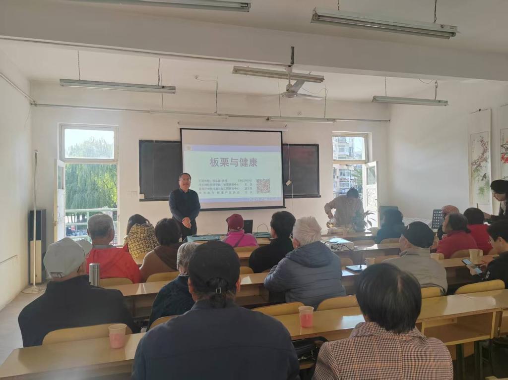 讲座现场,张京政教授结合自身专业研究,用通俗的语言介绍了板栗的种植历史、品种、特性等,重点讲解了板栗的营养优势。同时,他还贴心提醒食用禁忌,比如“板栗淀粉含量高,一次不宜吃太多”“消化功能弱的老人建议煮成粥或蒸着吃”,句句都是贴合老干部生活的实用建议。老同志们听得认真,遇到疑问随时举手咨询,张京政教授都耐心细致解答。张京政教授讲解风格风趣幽默,现场互动频繁,气氛热烈,掌声与笑声不断,为老同志们送上了一场健康科普盛宴。
