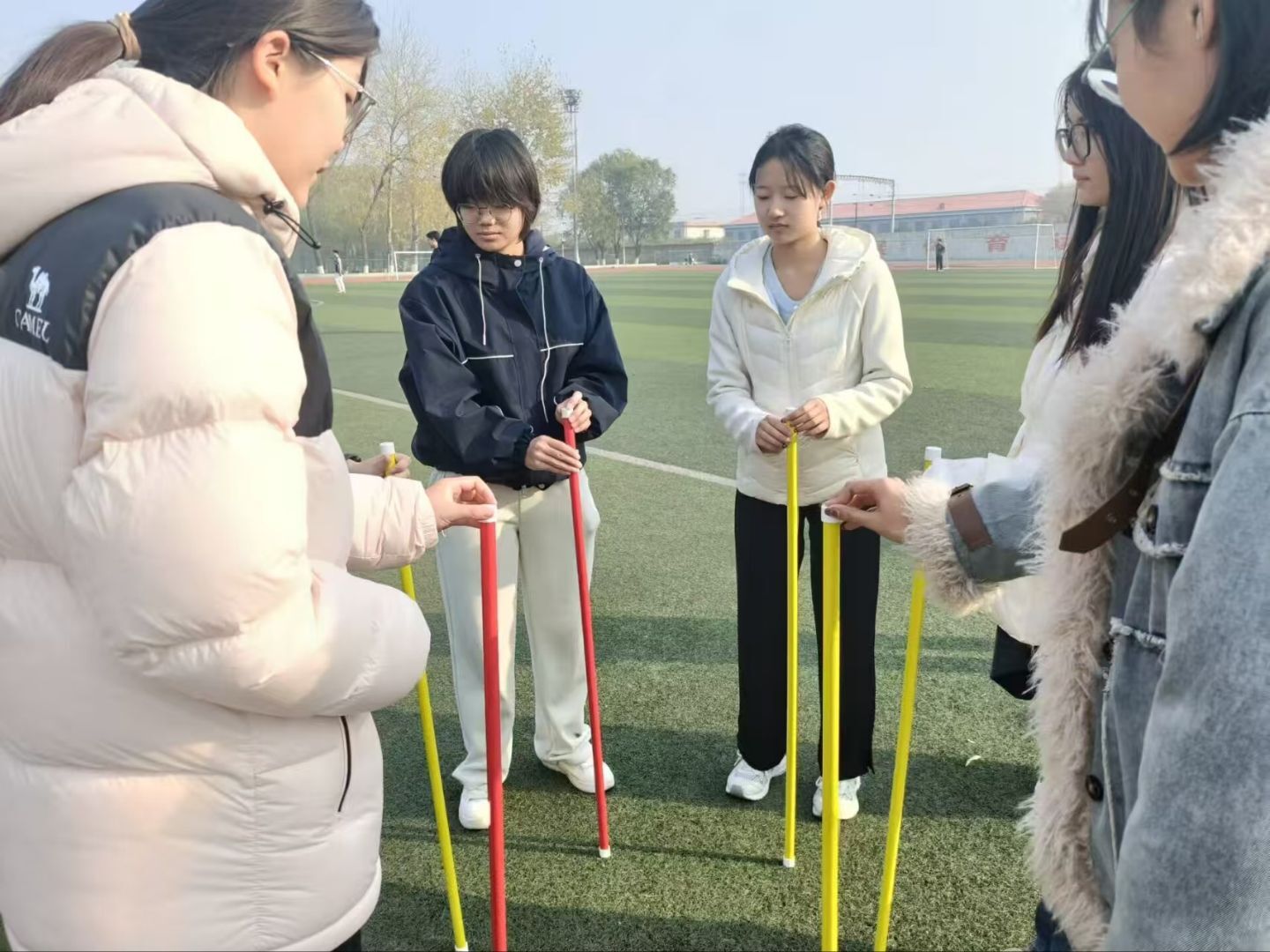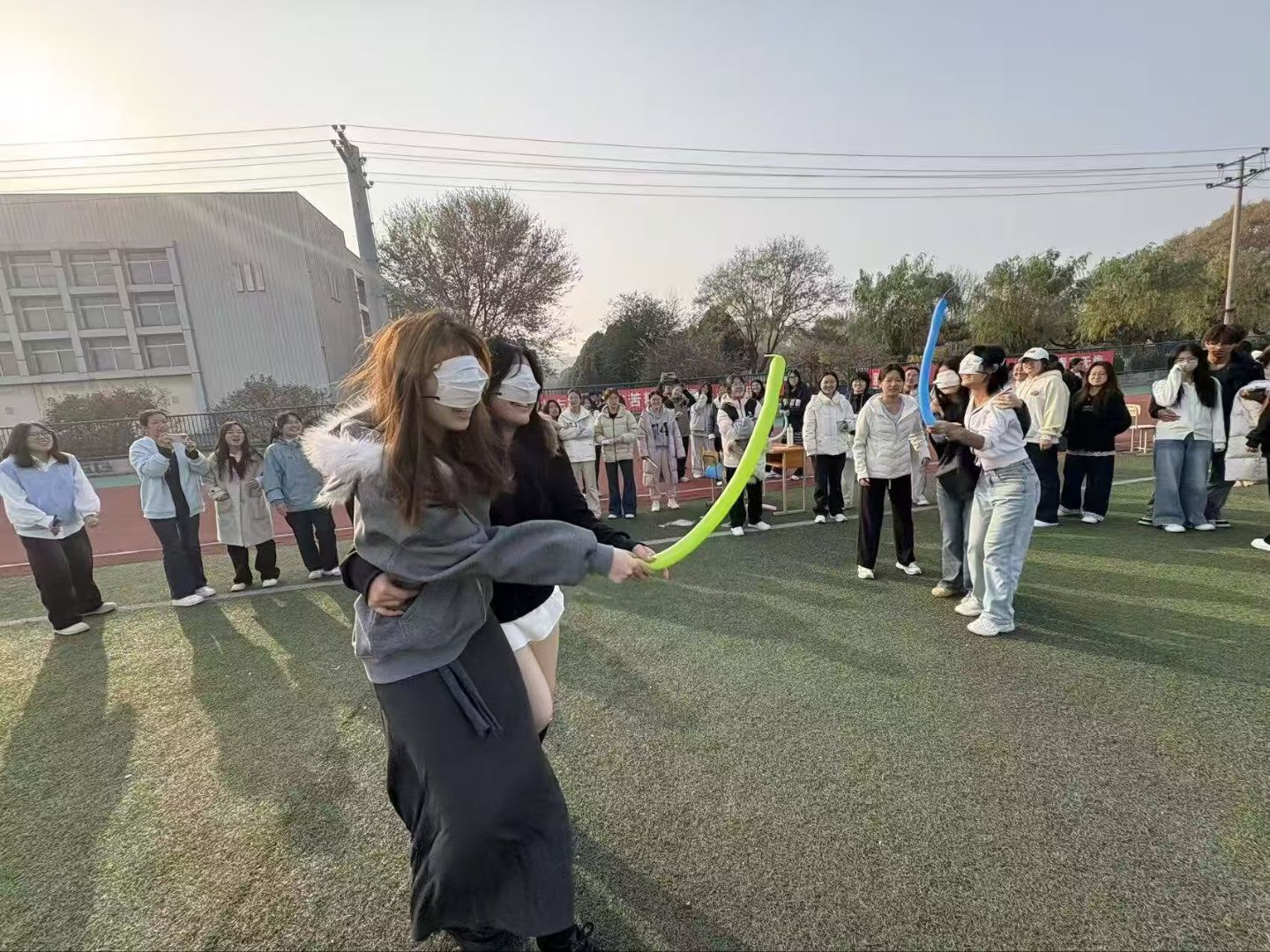 比赛现场,青春气息与竞技氛围交织相融。主持人详细解读各项游戏规则后,四大特色环节依次精彩上演。“一二三看这边”聚焦反应速度与专注力,选手们紧盯主持人手势,头部灵活转动,瞬间的胜负切换引得现场欢呼声此起彼伏;“气球传递”环节中,队员们仅凭脖子和下巴默契配合,小心翼翼护送气球,无手接触的规则设定让比赛既充满挑战又趣味十足;“不倒森林”里,六名队员各司其职、步调协同,在保持木棒直立的同时精准完成换位,每一次平稳衔接都赢得全场阵阵喝彩;“踩气球”项目堪称全场高潮,蒙眼的参赛选手与搭档勾肩搭背、同握长气球,在队友的精准指挥下奋勇出击,充分展现了彼此间的信任与协作。