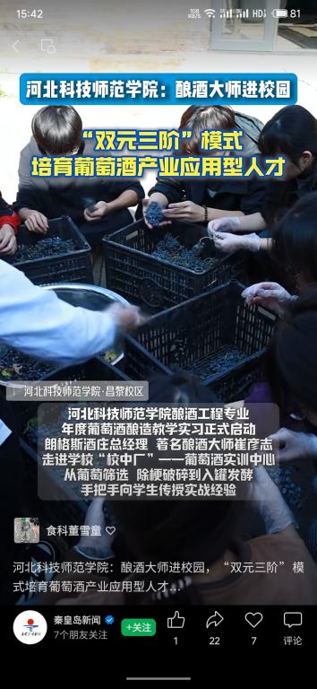 日前,秦皇岛新闻网对我校食品科技学院暨葡萄酒学院酿酒工程专业育人体系进行宣传报道。我校投资450万元建成630平米的葡萄酒全产业链实训中心,涵盖葡萄前处理、葡萄酒酿造、葡萄酒贮藏、葡萄酒冷冻及后处理四大功能车间,让学生在校内就能完成全生产流程实训。