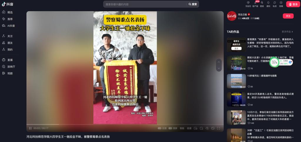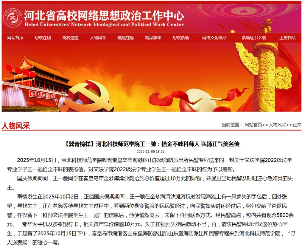 截至目前,我校文法学院王一驰同学拾金不昧事迹已被光明网、河北新闻网、河北省高校网络思想政治工作中心网、《河北日报》官方公众号、《河北青年报》官方抖音号、共青团河北省委官方抖音快手号、长城网.冀云客户端、昌黎县广播电视台抖音快手号等国内权威媒体平台广泛宣传报道!