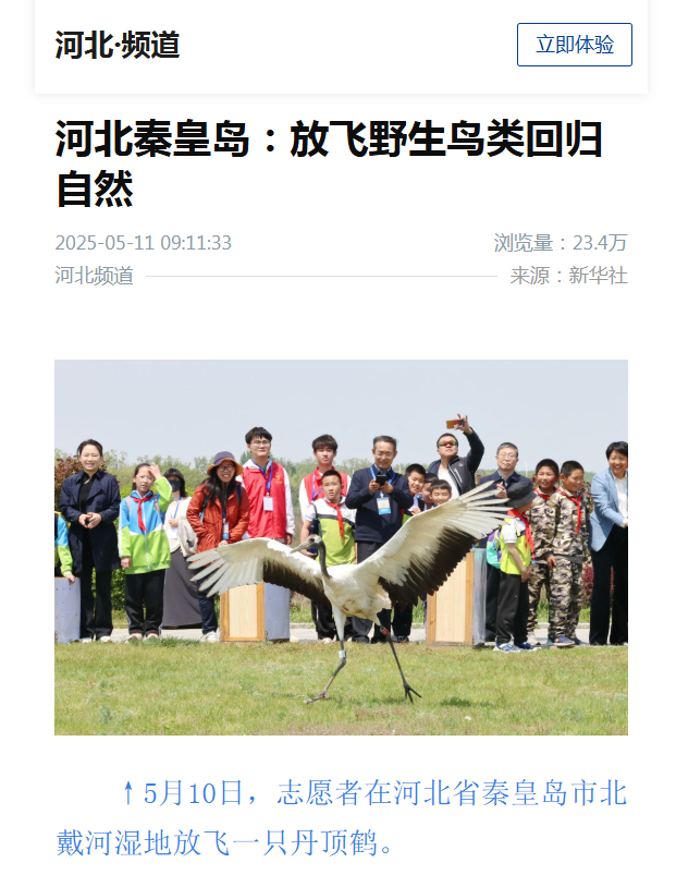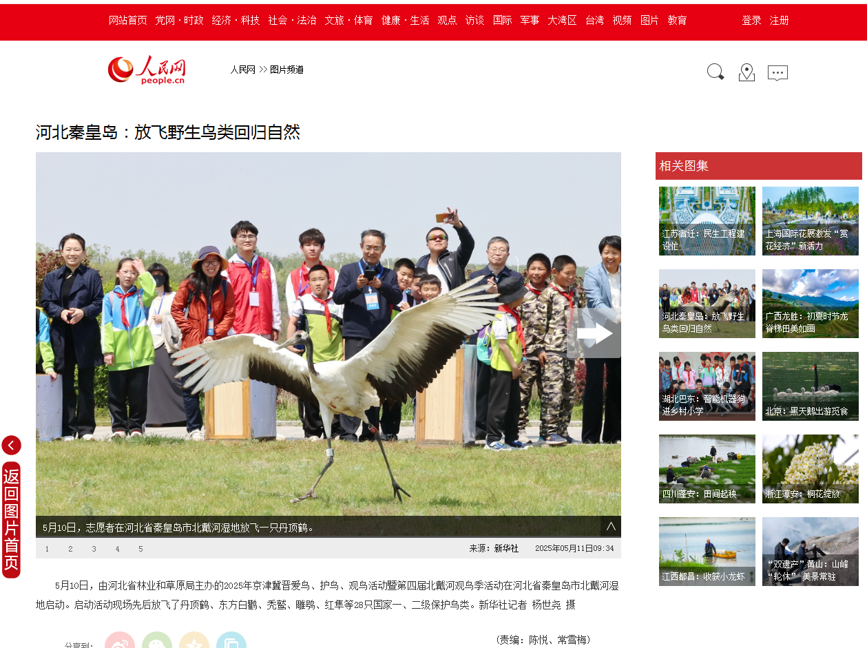 2025年5月11日,新华社以“河北秦皇岛:放飞野生鸟类回归自然”为题,对我校志愿者服务京津冀晋爱鸟、护鸟、观鸟活动暨第四届北戴河观鸟季活动进行了报道。人民网对活动进行了同步报道。