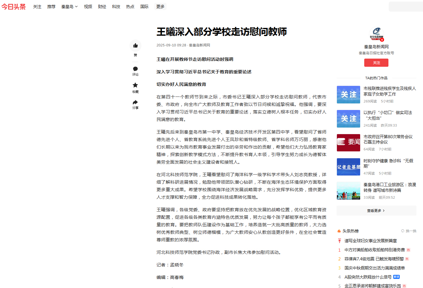2025年9月10日,秦皇岛新闻网以王曦深入部分学校走访慰问教师为题,对秦皇岛市委书记王曦深入我校走访慰问海洋科技研究中心刘志亮情况进行了宣传报道。今日头条网进行了同步报道。