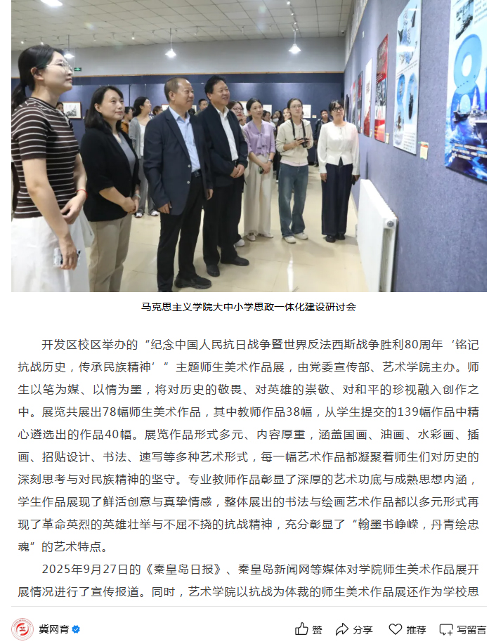 2025年9月27日,《秦皇岛日报》要闻版以“翰墨书峥嵘 丹青绘忠魂”为题,对我校艺术学院“弘扬抗战精神,庚续红色血脉”主题师生书画展进行了宣传报道。在纪念抗日战争暨世界反法西斯战争胜利八十周年之际,艺术学院全体师生在学院党委的支持鼓舞下,在学院院长刘进成教授的带领下,以笔为媒,以情为墨,将对历史的敬畏,对英雄的崇敬,对和平的珍视融入创作之中,用翰墨丹青绘出中华儿女浴血奋战、不屈抗争的感人画面,引导广大青年学子传承和弘扬伟大抗战精神,争做有理想、敢担当、能吃苦、肯奋斗的新时代好青年,为学校特色鲜明的高水平应用型大学建设而努力奋斗!
