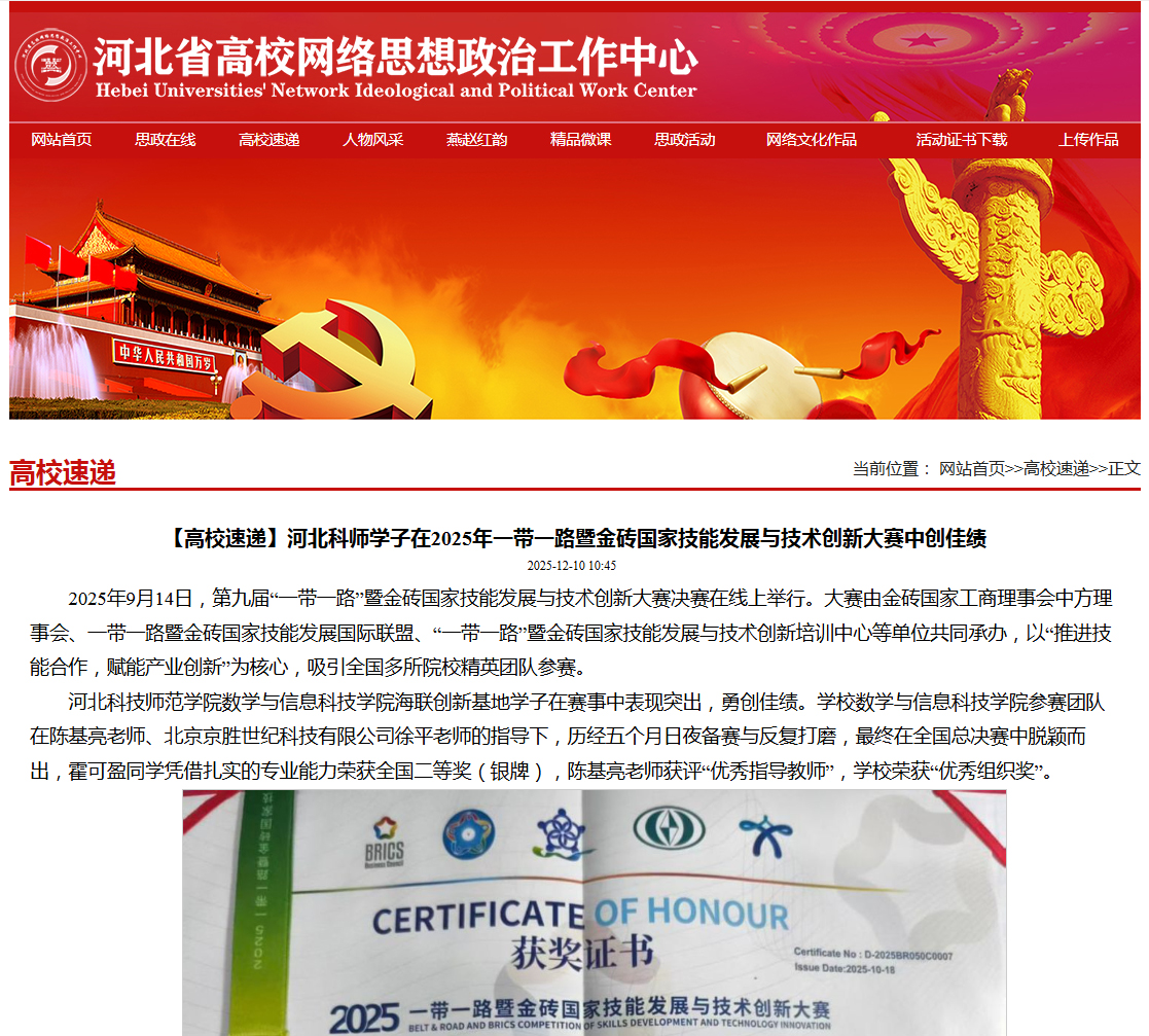 2025年12月10日,河北省网络思想政治工作中心网以“河北科师学子在2025年一带一路暨金砖国家技能发展与技术创新大赛中创佳绩”为题,对我校数学与信息科技学院学子在2025年一带一路暨金砖国家技能发展与技术创新大赛中勇创佳绩情况进行了宣传报道。